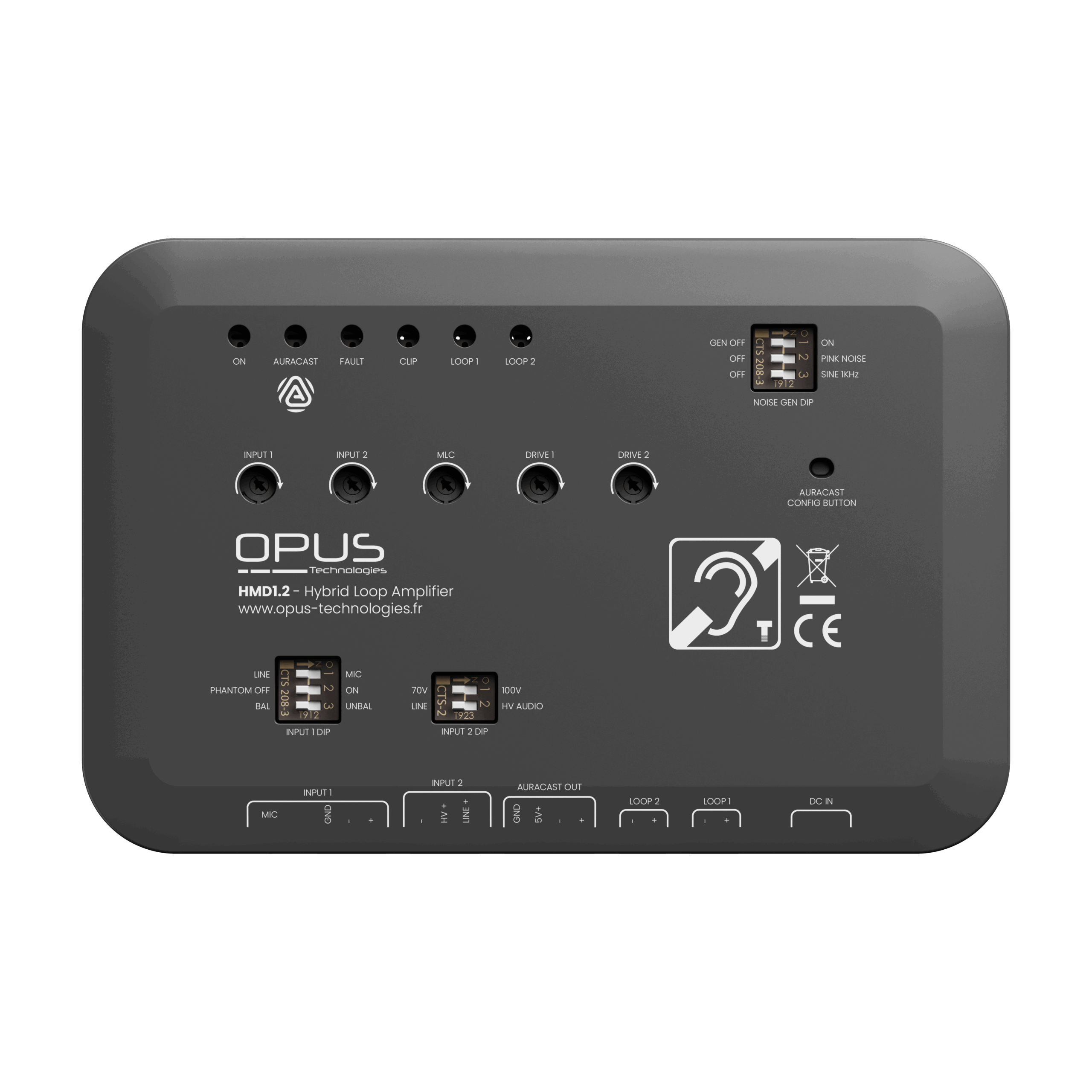 The HMD1.2A is a hybrid amplifier featuring a 2-channel loop amplifier (2 × 3.5 A) and an Auracast™ transmitter, which, when used with its standard power supply (24 V, 3 A), is suitable for rooms up to 100 m².