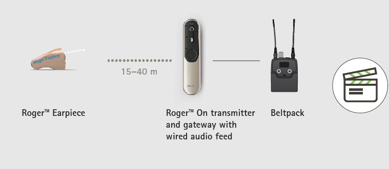 IEM/IFB system. Rogerâ„¢ On receives a hard-wired audio signal from the beltpack and provides wireless transmission to the Rogerâ„¢ earpiece. This configuration offers the advantage of UHF transmission over long distances in open spaces.