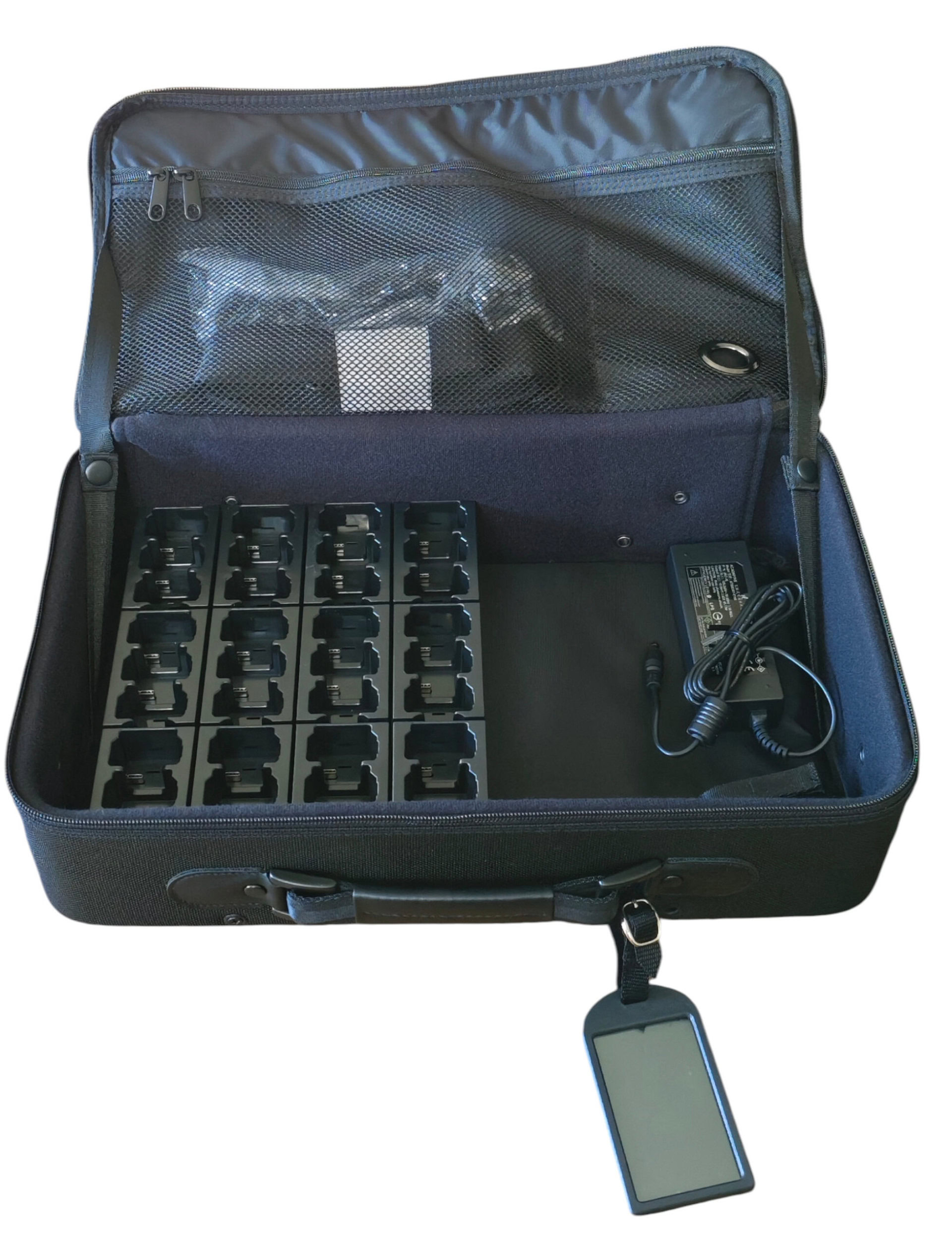 Praktische Nylontasche zum Aufbewahren und Laden von insgesamt 36 Geräten (Sender und Empfänger kombiniert) mit Umhängeriemen und Seitentaschen für Zubehör.