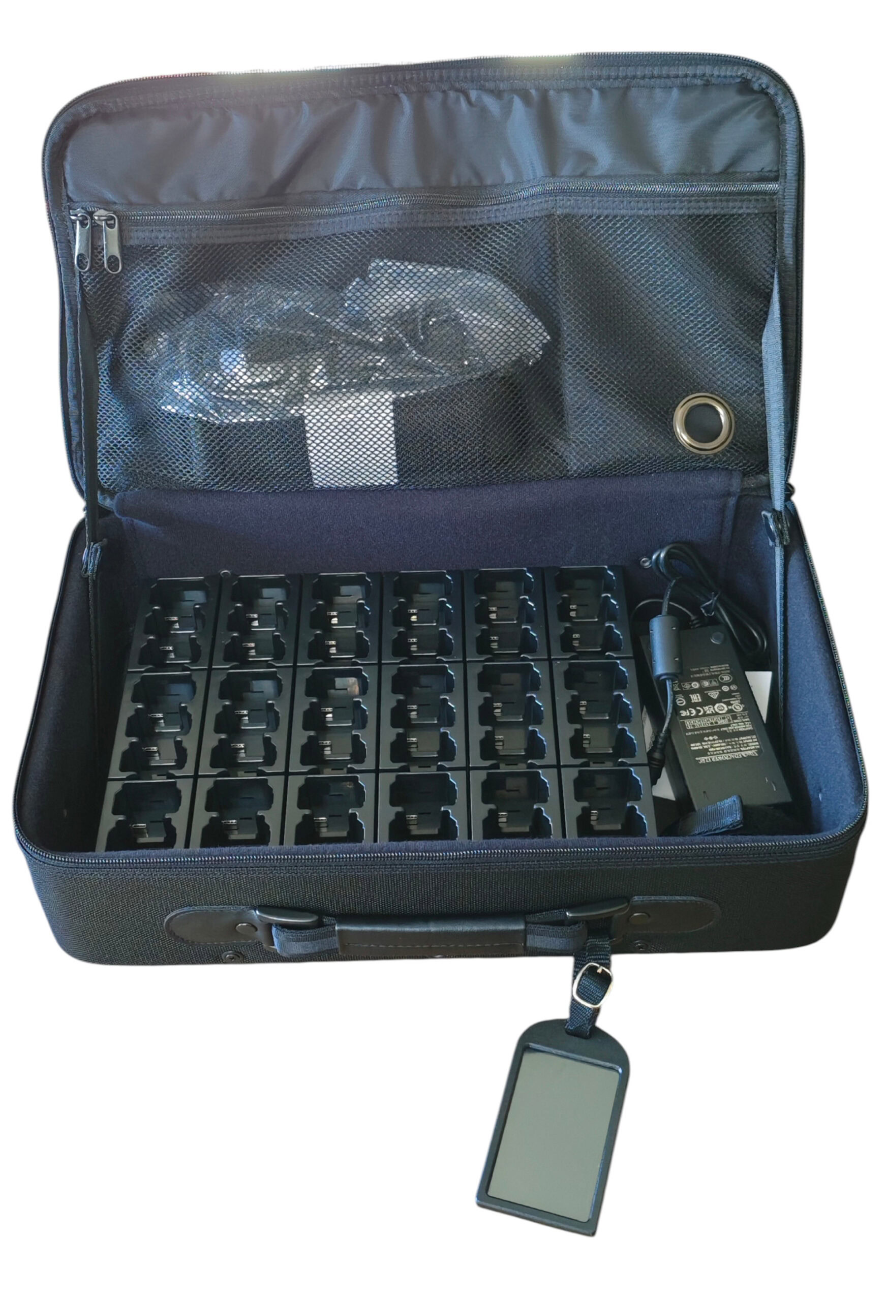 Praktische Nylontasche zum Aufbewahren und Laden von insgesamt 54 Geräten (Sender und Empfänger kombiniert) mit Umhängeriemen und Seitentaschen für Zubehör.